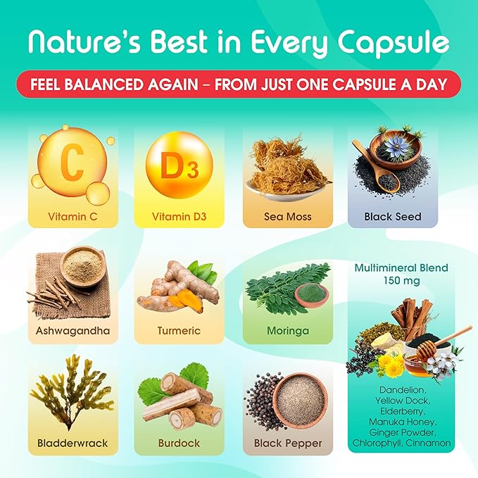 - 17-in-1 POTENT BLEND: Combined Sea Moss with Black Seed, Ashwagandha, Turmeric, and more to support immune function, joint health, and skin wellness, helping you feel your best from the inside out. Made in the USA with premium, carefully selected ingredients.