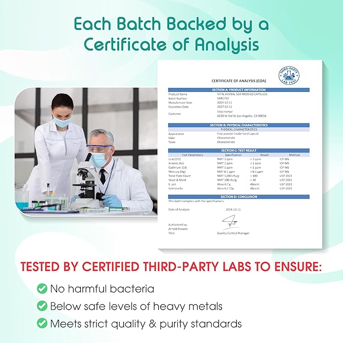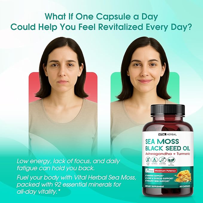Sea Moss with Black Seed Oil, Ashwagandha, Turmeric & Moringa – Immune, Joint & Skin Support Supplement – 60 Capsules – Vital Herbal – Lab-Tested, Non-GMO, Made in USA