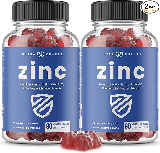 NutraChamps 4-in-1 Zinc Gummies, 50mg Chewable Zinc Supplement Gummies with Vitamin D3 2000 IU, Elderberry & Echinacea, Immune, Heart & Brain Support, 180 Count (Pack of 2)