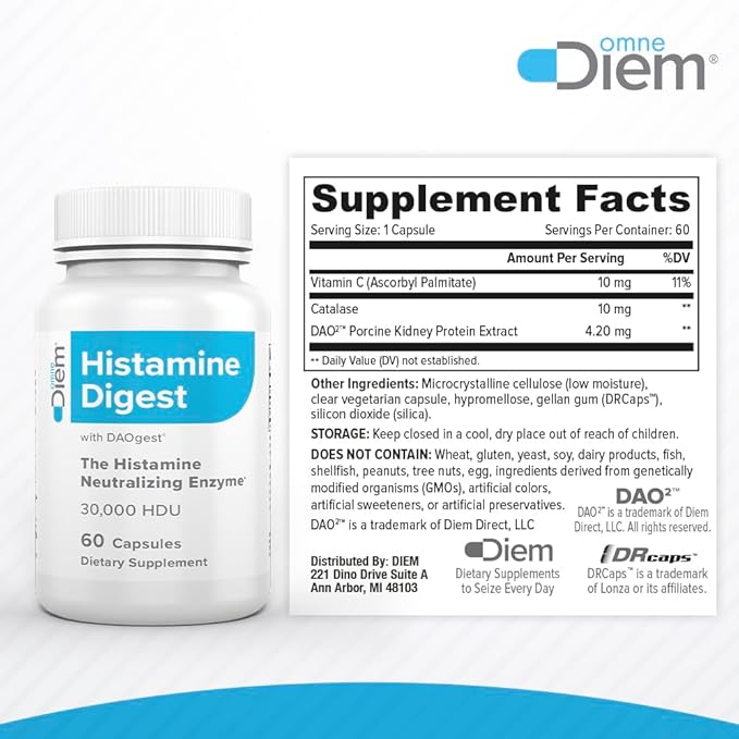 - Combat Histamine Sensitivity & Enhance Digestion – Designed for those sensitive to histamine, OmneDiem Histamine Digest helps mitigate histamine-induced discomfort before it starts. DAO works by degrading excess histamine from food, preventing it from triggering adverse reactions. Whether you're sensitive to aged cheeses, fermented foods, red wine, or cured meats, this supplement provides essential support to ease gastric distress, inflammation, and other histamine-related symptoms, ensuring greater meal tolerance.