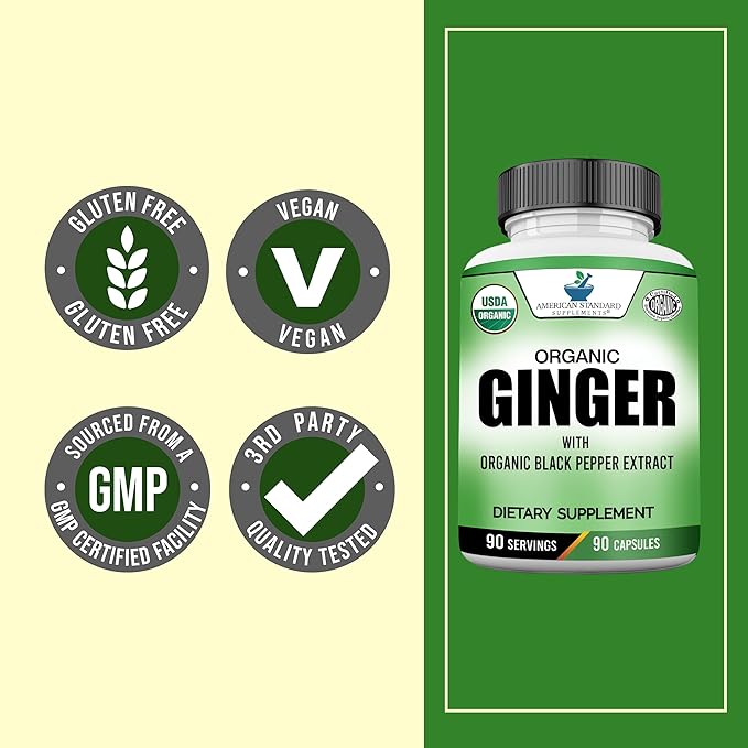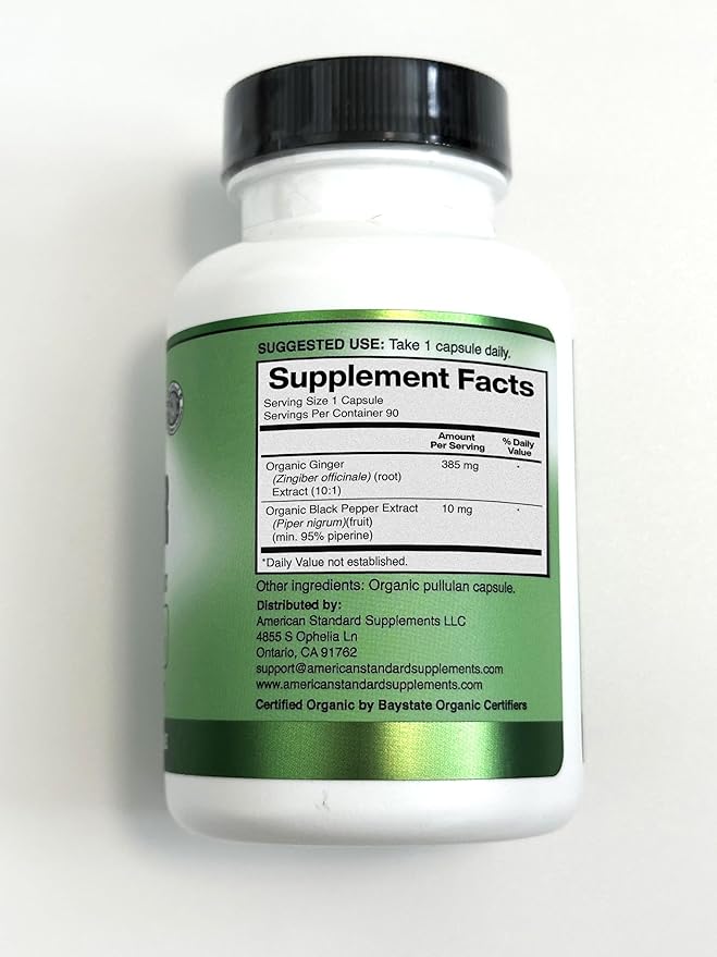 American Standard Supplements Organic Ginger Extract with Organic Black Pepper Extract, Vegan, Gluten Free, Non-GMO, 90 Capsules, 90 Servings