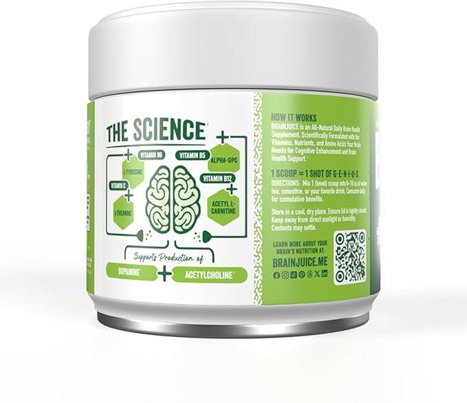 - CLEAN ENERGY SUPPORT: BrainJuice isn’t your average energy drink, coffee, or quick caffeine fix, our formula is thoughtfully developed, fast acting, and will never leave you tired or depleted throughout the day. We balance 75mg of Organic Green Tea Leaf Extract with L Theanine for a sustainable flow of energy.
