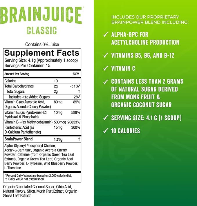 BrainJuice Nootropics Brain Support Supplement, Gluten Free Powder for Energy and Focus, Drink Mix with L Theanine, Alpha GPC, Vitamin B, Organic Green Tea Extract Caffeine, Classic, 15 Servings