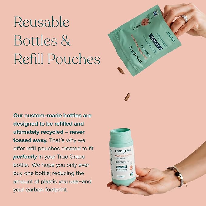 - SUSTAINABLE PACKAGING – Our supplements are delivered in custom-made, reusable bottles made from recycled plastics. We also offer earth-friendly refill pouches made from plant-based materials. Using pouches to refill True Grace bottles minimizes our carbon footprint—and yours. Plus, every time you purchase a bottle or pouch of True Grace products, plastic is pulled out of the ocean through our partnership with ReSea Project.