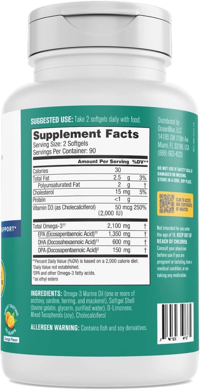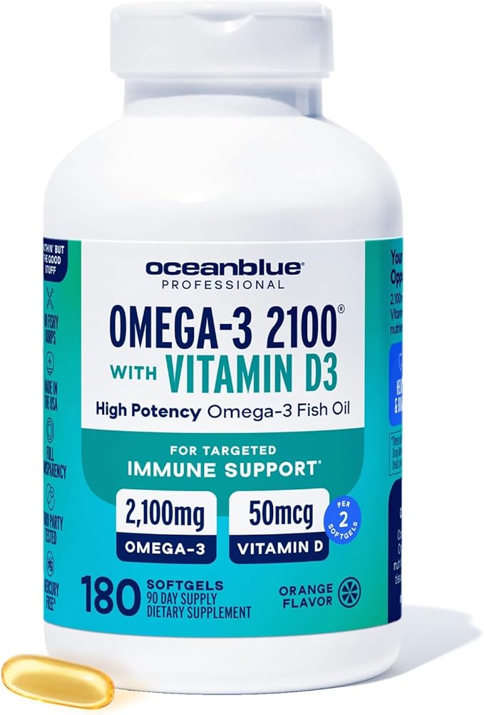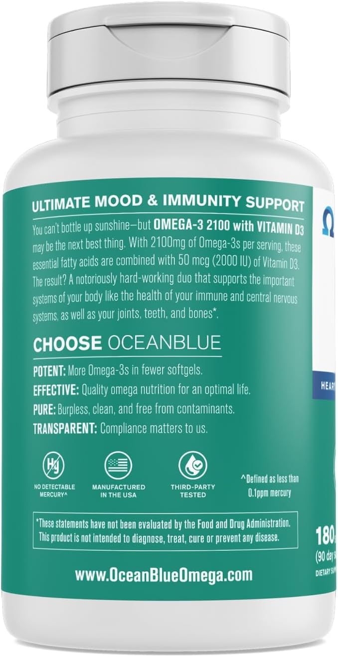 - 2-IN-1 OMEGA-3 SUPPLEMENT: OceanBlue Omega-3 2100 with Vitamin D3 combines our triple-strength 2100 mg of Omega 3 fish oil with 2,000 IU of Vitamin D3 to help support a healthier body and simplify your daily wellness routine with fewer capsules