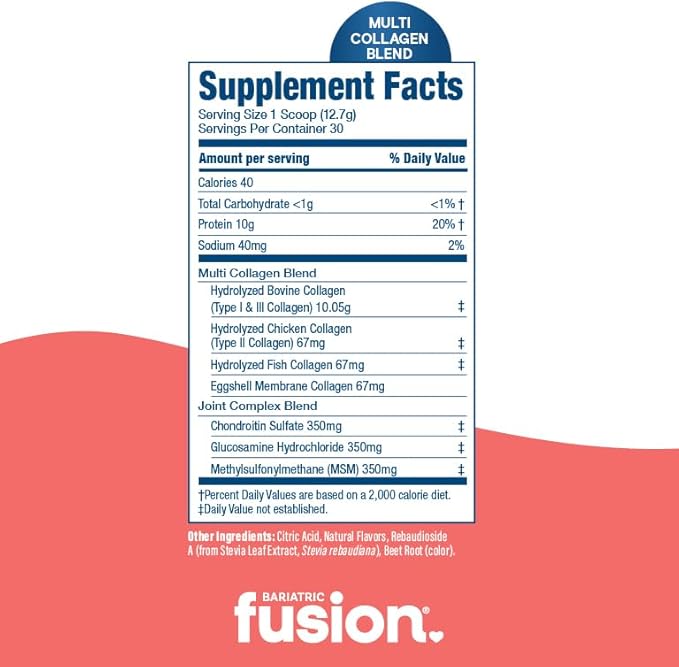 - Advanced Collagen Formula: This unique formula provides easily digestible collagen peptides in order to support natural collagen formation and may aid in bone and cardiovascular health, hair and nail growth, restoring skin elasticity and joint mobility.* Each scoop of Bariatric Fusion's Multi Collagen provides Types I, II, III, V, X, sourced from Bovine Collagen, Chicken Collagen, Eggshell Membrane Collagen, and Fish Collagen Peptides.