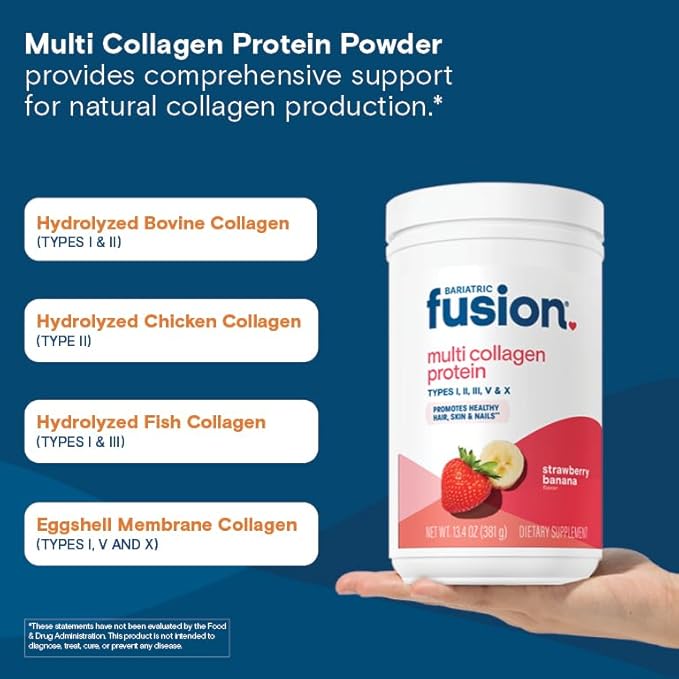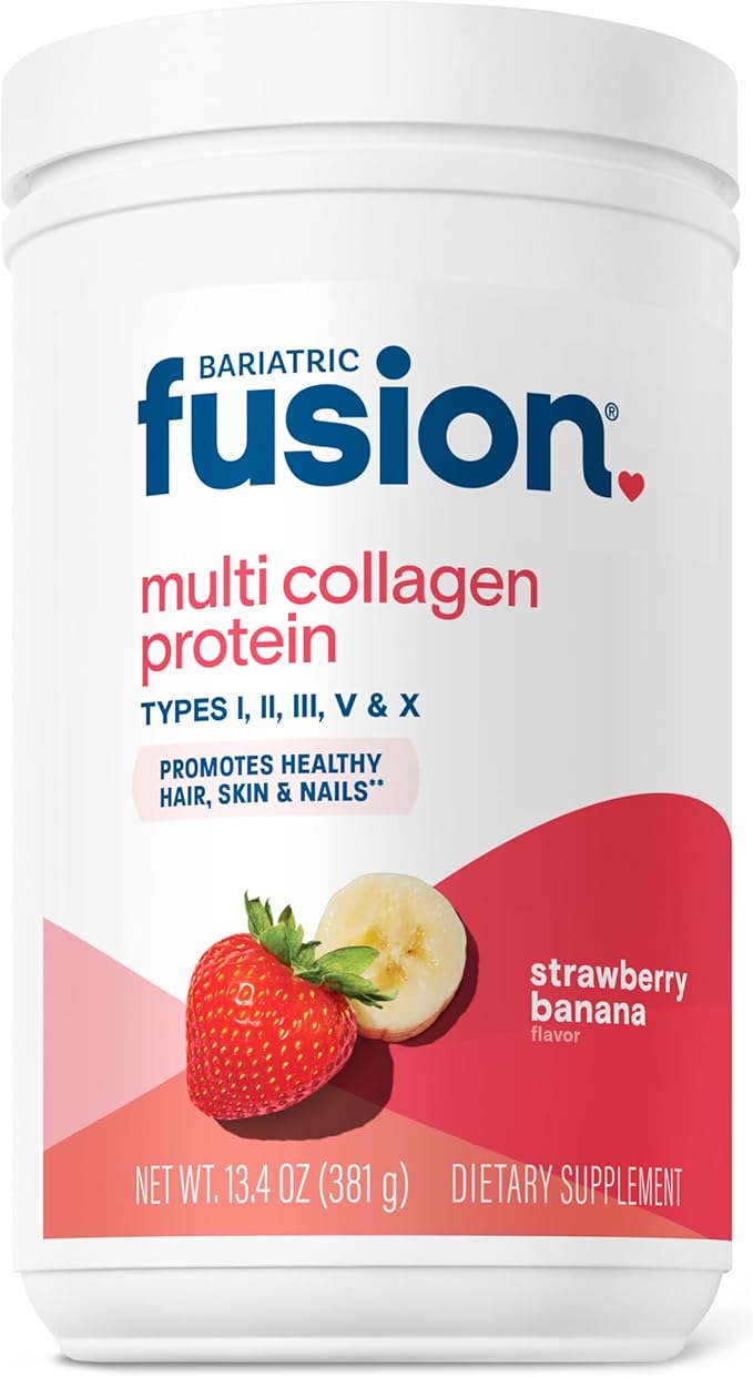 - Bariatric Formulation: A premium daily multi collagen protein powder designed for bariatric patients. This unique Strawberry Banana flavored Multi Collagen supplement contains over 10g of our Multi Collagen Blend, 10g of Protein, and our unique joint complex. Our Joint Support Complex includes MSM, Glucosamine, and Chondroitin that may Ease Inflammation and Promote Joint Support.* Collagen may also help Bariatric Patients with Skin Elasticity after surgery.*