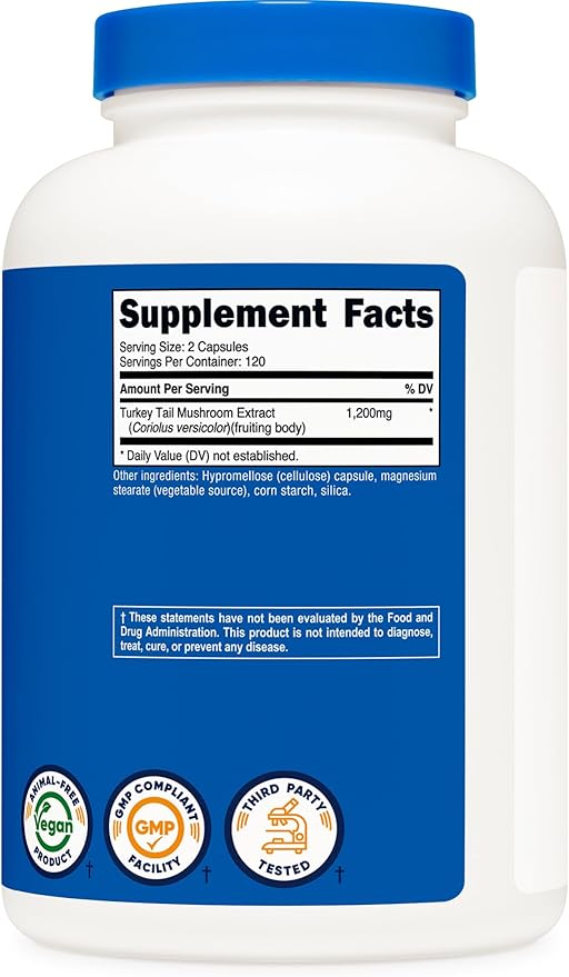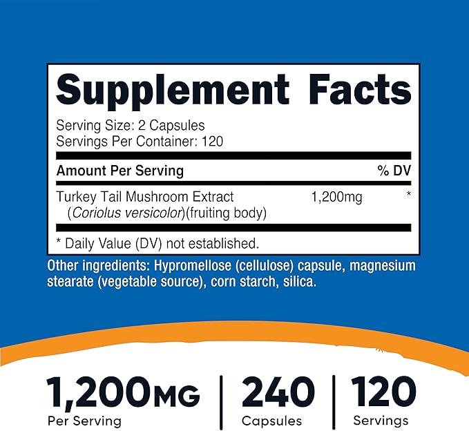 - 1,200mg Turkey Tail Mushrooms Per Serving, 600mg Per Capsule