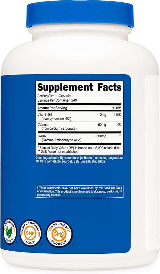 Nutricost GABA (Gamma Aminobutyric Acid) + Vitamin B6, 500mg per Serving, 240 Capsules