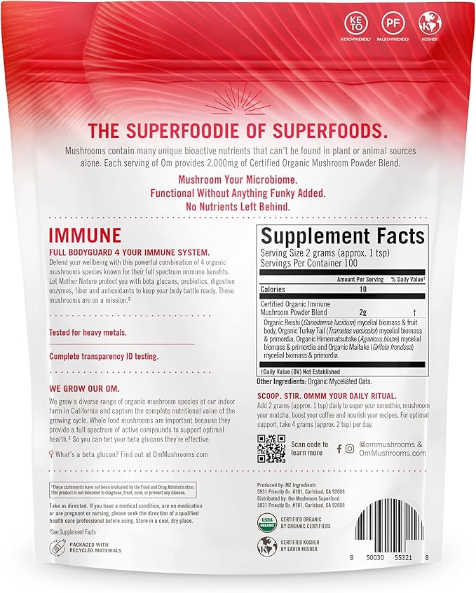 - Contains 1 pouch (200g) of Om Mushroom Immune Superfood Powder