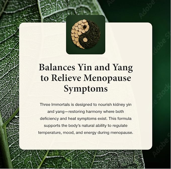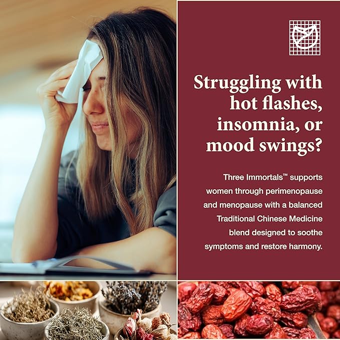 - Health Benefits - Three Immortals helps to ease menopause and perimenopause discomfort with a blend of natural ingredients designed to help with hot flashes and sweating while promoting a healthy hormone balance for women.