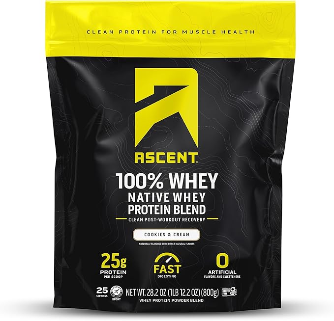 Ascent 100% Whey Protein Powder - Post Workout Whey Protein Isolate, Zero Artificial Flavors & Sweeteners, Gluten Free, 5.5g BCAA, 2.6g Leucine, Essential Amino Acids, Cookies & Cream 1.7 lb