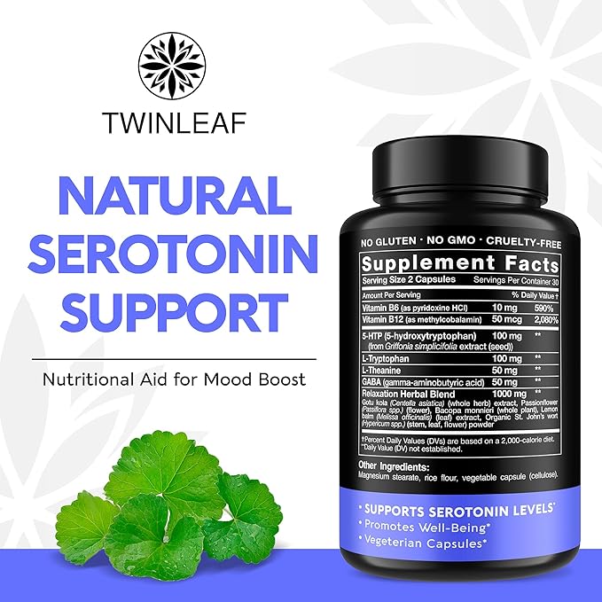 - Serotonin Supplement for Overall Health - boost your health with Twinleaf Serotonin Booster! This natural serotonin supplement for women and men is filled with L-tryptophan, 5-HTP, GABA, and B vitamins - ingredients that help you produce and absorb your serotonin. Serotonin supports your overall health, well-being, and energy levels, so it's a great source of wellness!