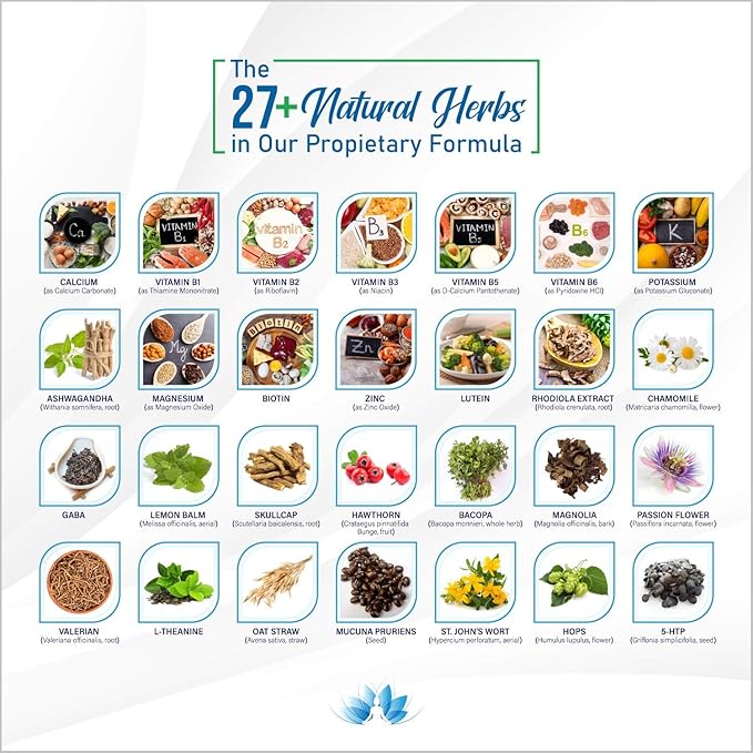 - Powerful 28 in 1 Supplement: Doctor formulated with 28 powerful natural herbs that are scientifically proven mood enhancers used for centuries, our product aims to deliver the relief your body needs to overcome the challenges of the modern world. Our proprietary blend includes Rhodiola, Luetin, Ashwagandha, Gaba, Lemon Balm, 5-HTP, Magnesium, ST John's Wort, Vitamins B1 B2 B3 B6, Chamomile, Zinc and much more! A complete 28 in 1 Natural supplement.