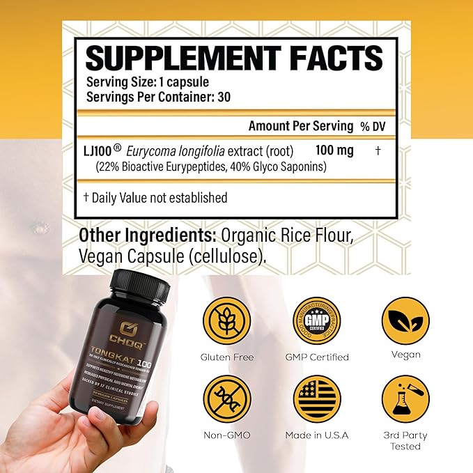 CHOQ Tongkat Ali Extract 100mg - Testosterone Booster for Men - LJ100 Longjack Clinically Proven - Malaysian Eurycoma Longifolia with 40% Glycosaponins - 30 Capsules