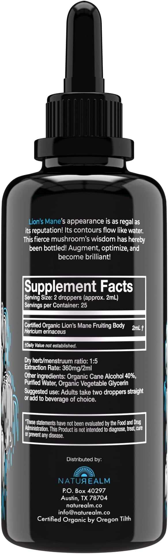 Naturealm Lion’s Mane Mushroom Liquid Tincture Supplement – Focus, Memory & Brain Health, Vegan, Non-GMO – Organic Fruiting Bodies, 1 Month Supply