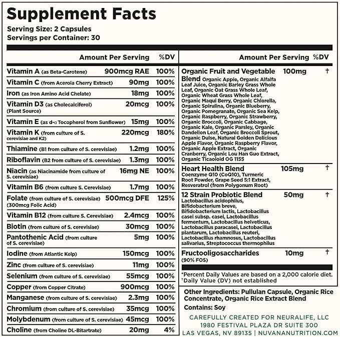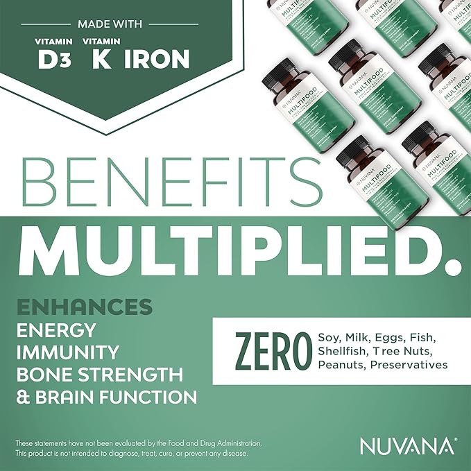 - IMMUNE SYSTEM BOOST: Nuvana's Multifood is essential for women as it contains a unique blend of Coenzyme Q10 (CoQ10), turmeric, grape seed extract, and Resveratrol. The supplement's Iron and Vitamins D3 & K are crucial in enhancing the immune system and strengthening bones, which are especially important for women.