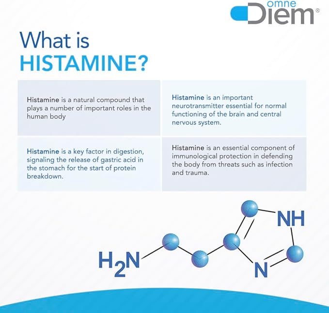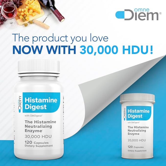 - Combat Histamine Sensitivity & Enhance Digestion – Designed for those sensitive to histamine, OmneDiem Histamine Digest helps mitigate histamine-induced discomfort before it starts. DAO works by degrading excess histamine from food, preventing it from triggering adverse reactions. Whether you're sensitive to aged cheeses, fermented foods, red wine, or cured meats, this supplement provides essential support to ease gastric distress, inflammation, and other histamine-related symptoms, ensuring greater meal tolerance.