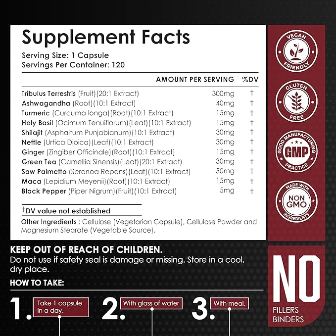 - Supplement Facts (Per Serving - 1 Capsule, 120 Servings Per Container): Tribulus Terrestris Extract, Ashwagandha Root Extract, Saw Palmetto Extract, Shilajit Extract, Green Tea Extract, Nettle Leaf Extract, Ginger Root Extract, Turmeric Root Extract, Holy Basil Extract, Black Pepper Extract. Other Ingredients: Vegetable Cellulose