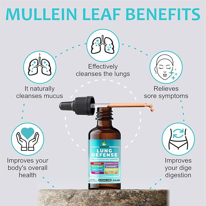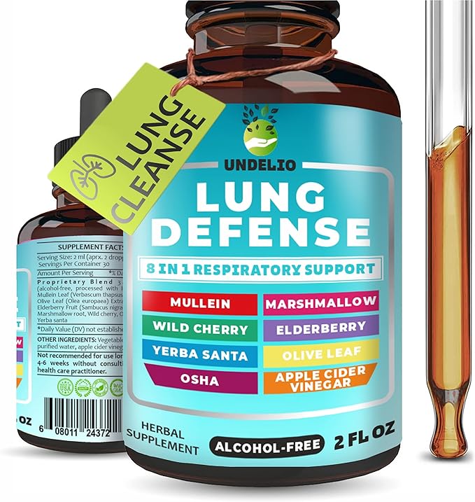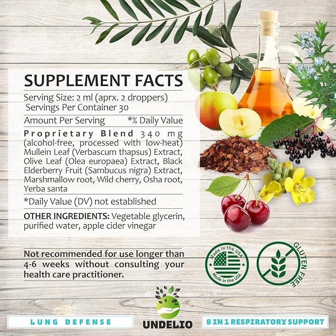 8 in 1 Lung Defense Herbal Extract, Blend (Mullein-Marshmallow-OSHA-Wild Cherry-Elderberry-Yerba Santa-Olive Leaf-ACV) Lung Cleanse, Respiratory & Immune System Support. Liquid Supplement 2 OZ
