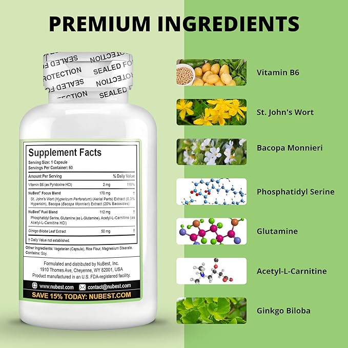 - Ultra Strength Formula of NuBrain Supplement: Our brain supplement is designed with “brain foods” including St. John’s Wort, Bacopa Monnieri Vitamin B6, Ginkgo Biloba, Glutamine, Phosphatidylserine, Acetyl L-carnitine. These nutrients work as brain boosters that fuel neurotransmitters, and keep your mind and memory sharp.