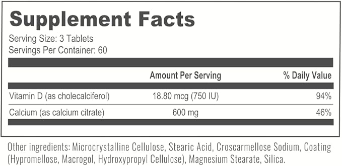 - 600 mg of calcium per serving, 750 IU of vitamin D3 per tablet