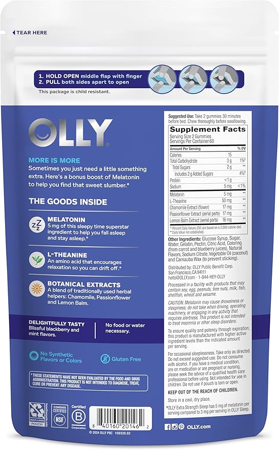 - OLLY EXTRA STRENGTH SLEEP GUMMIES: Melatonin gummies, with L-Theanine that works with your body to help you fall asleep and stay asleep*