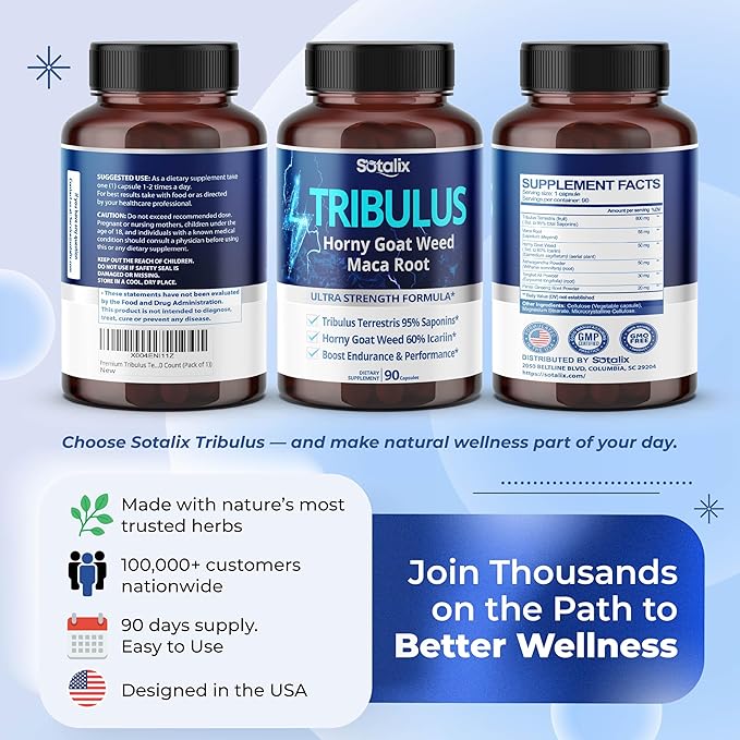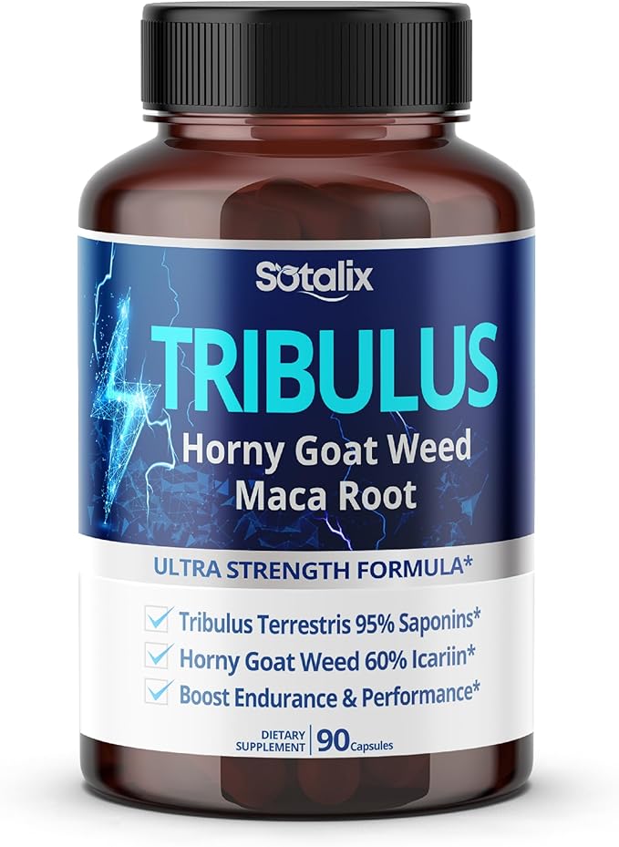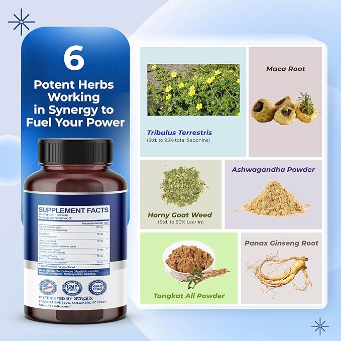 - Unique Combination - 6in1: Sotalix Tribulus Terrestris Supplement includes 6 premium ingredients in every capsule that brings better efficiency for you. Tongkat Ali, Maca Root, and Panax Ginseng work together to support muscle growth and enhance your workout performance while a blend of Tribulus Terrestris, Horny Goat Weed, and Ashwagandha help to increase your energy levels and promote your intensity.