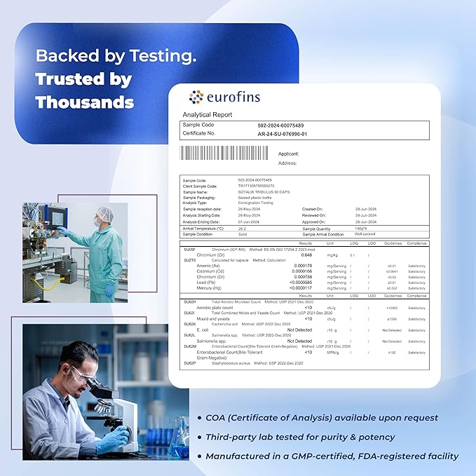 - 100% Natural - Safe And Effective: Sotalix Tribulus Terrestris has been tested by 3rd-party labs. It contains only pure vegetarian ingredients and is completely free of harmful chemicals. If you follow a vegetarian diet, our supplement is the perfect option for you. So you can use it without any concerns about its origin.