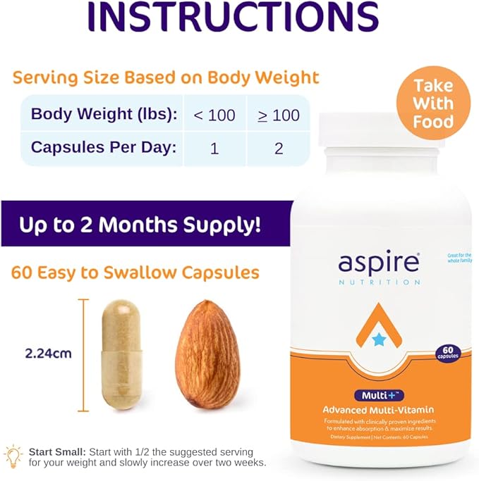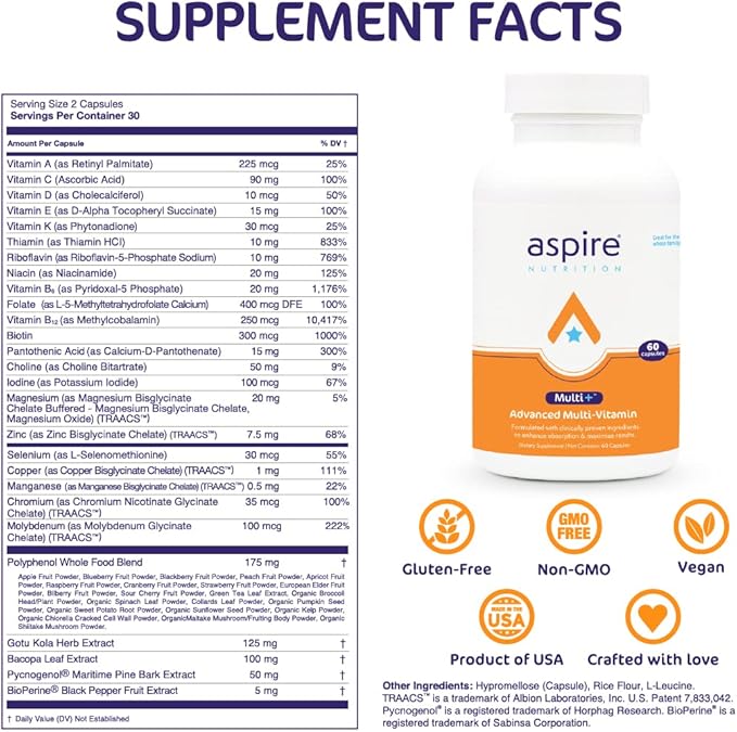 Aspire Multi+™ Advanced Multivitamin for Men, Women & Kids - Best Supplement for Focus, Attention, Memory, Mood. More Absorbent Nutrients, Minerals and Vitamins - All Natural