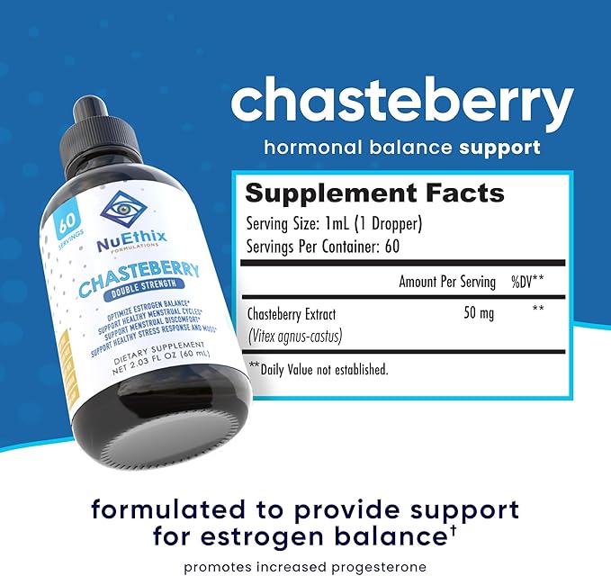 - Women's Wellness: This herbal double strength supplement with 50mg of chasteberry may aid in supporting estrogen balance via increased progesterone, may help with menstrual regularity, and may help with menstrual discomfort