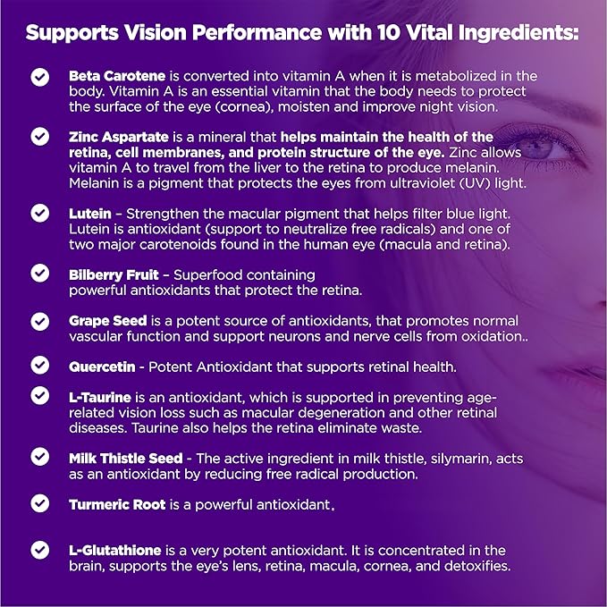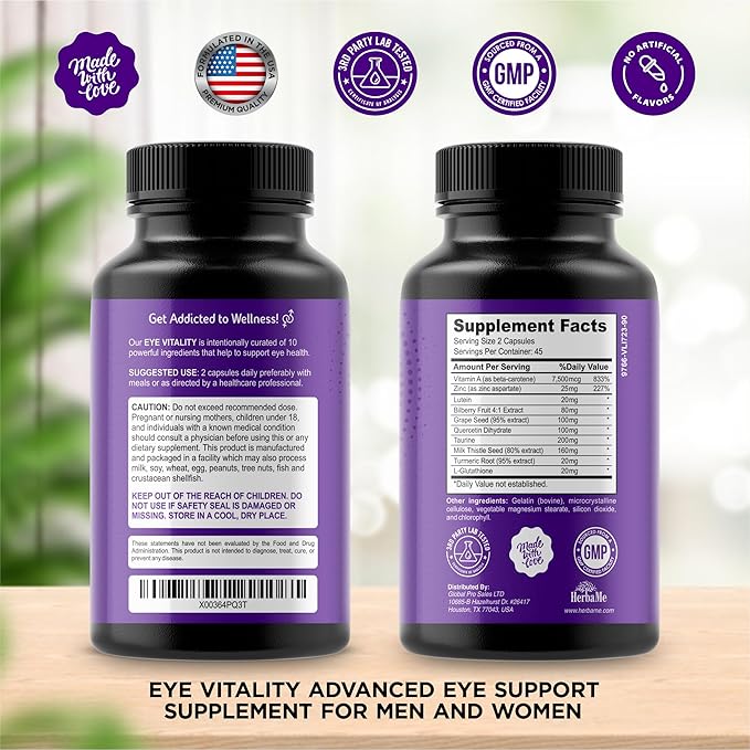 - Lutein-Based Vision Supplements – Fortified with Lutein, Vitamin A as Beta Carotene, Grape Seed, Milk Thistle, L-Glutathione, Turmeric, Antioxidants, and other eye-essential vitamins and minerals our dry eye supplement nourishes and protects the eyes while support restoring macular pigment and supporting healthy vision.