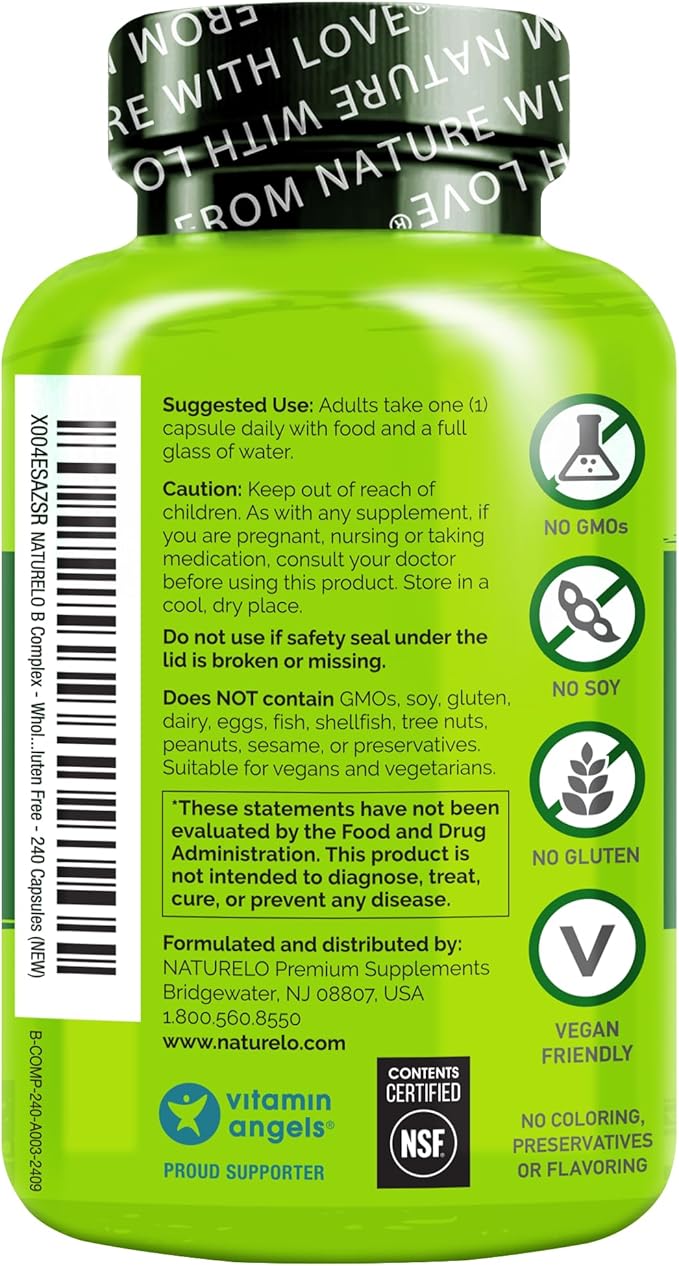 NATURELO Vitamin B Complex with Methyl B12, Methyl Folate, Vitamin B6, Biotin Plus Choline, CoQ10, and Fruit & Vegetable Blend - Supports Energy & Healthy Stress Response - Vegan - 240 Capsules