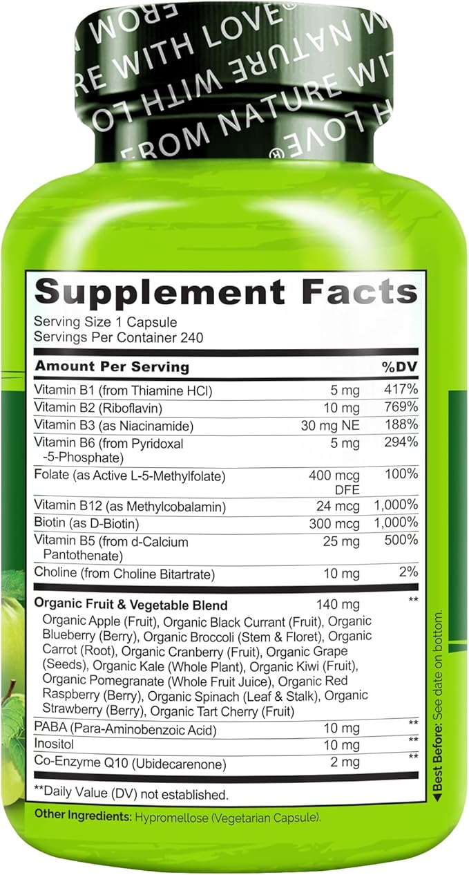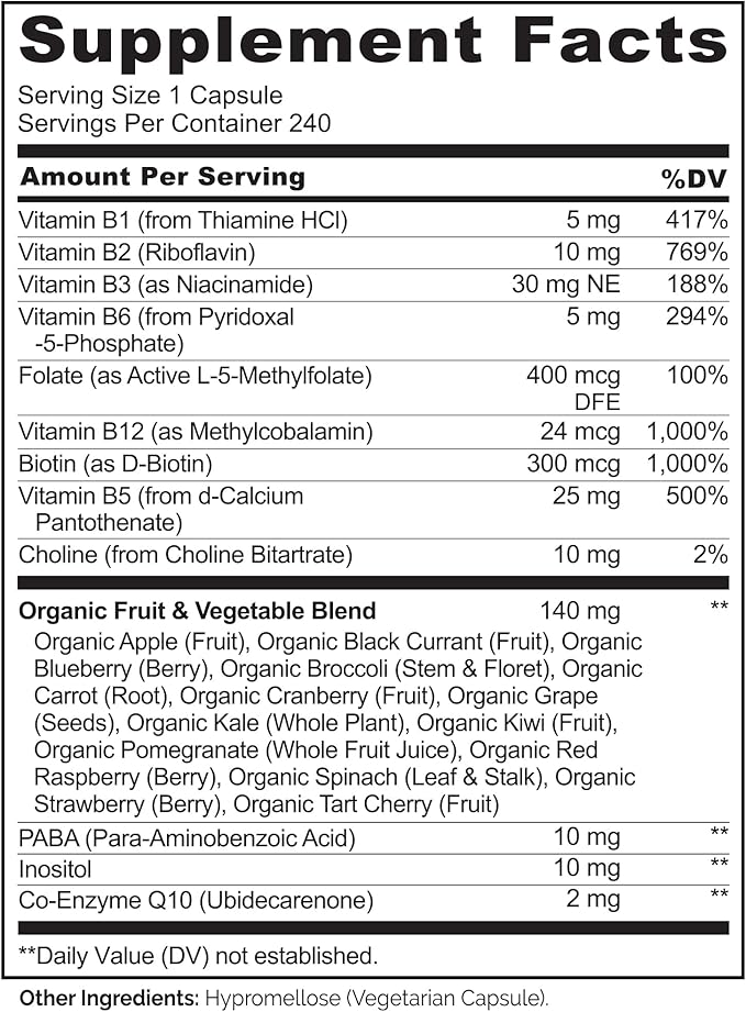 - Complete B Complex: All 8 B vitamins, including Thiamine (B1), Riboflavin (B2), Niacin (B3), Pantothenic acid (B5), Biotin (B7), Folate (B9), B6 and B12, with important co-nutrients like Choline, Inositol, and PABA, plus CoQ10.