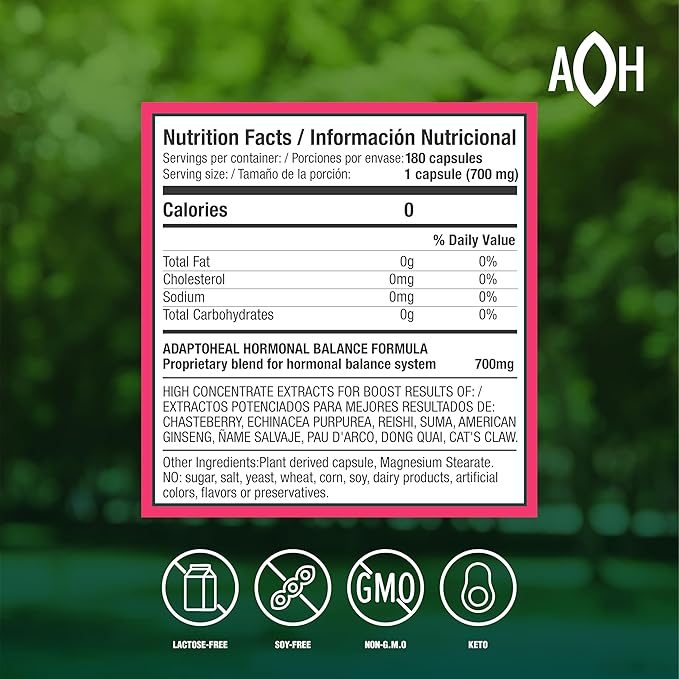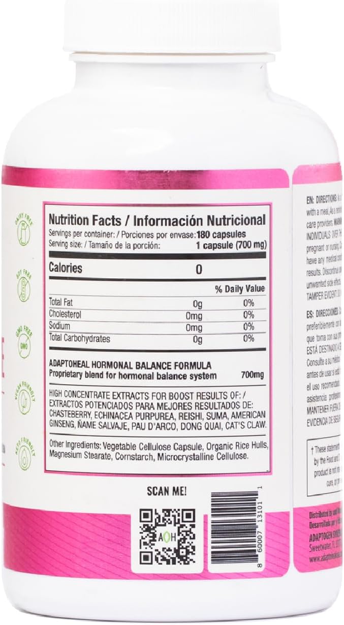 - HORMONE BALANCE SUPPORT WITH ADVANCED ADAPTOGENS - Adaptoheal Hormobalance combines adaptogens and concentrated botanical extracts such as Vitex (Chasteberry), American Ginseng, and Reishi to help support natural hormone balance for women.