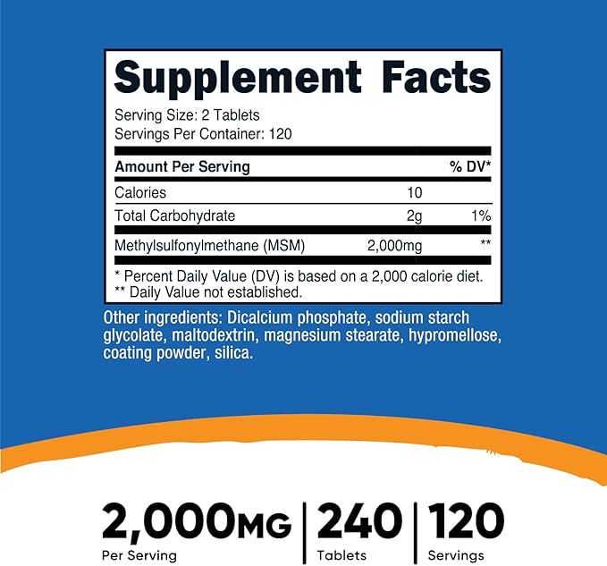 - 240 Tablets of MSM For 120 Servings (4 Month Supply If Taken As Directed)