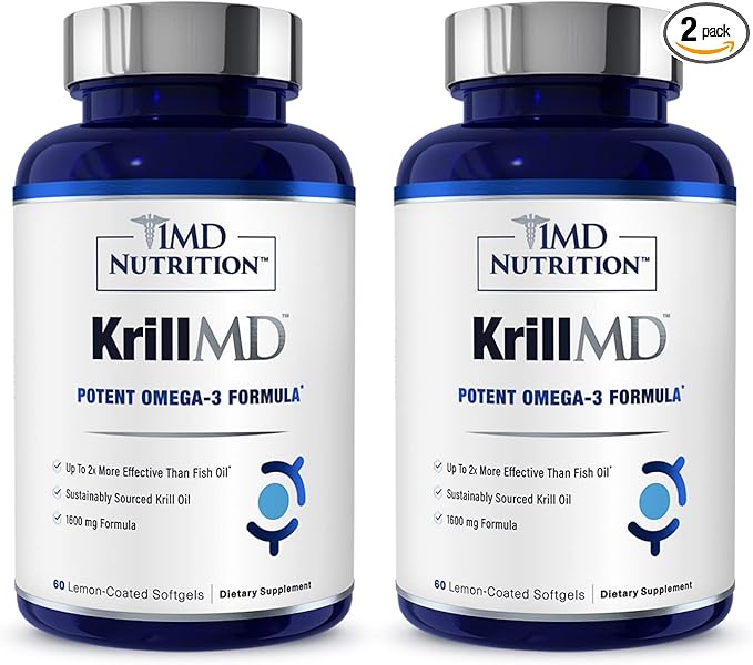 1MD Nutrition KrillMD - Antarctic Krill Oil Omega 3 Supplement with Astaxanthin, EPA, DHA | 2X More Effective Than Fish Oil | 60 Softgels (2-Pack)