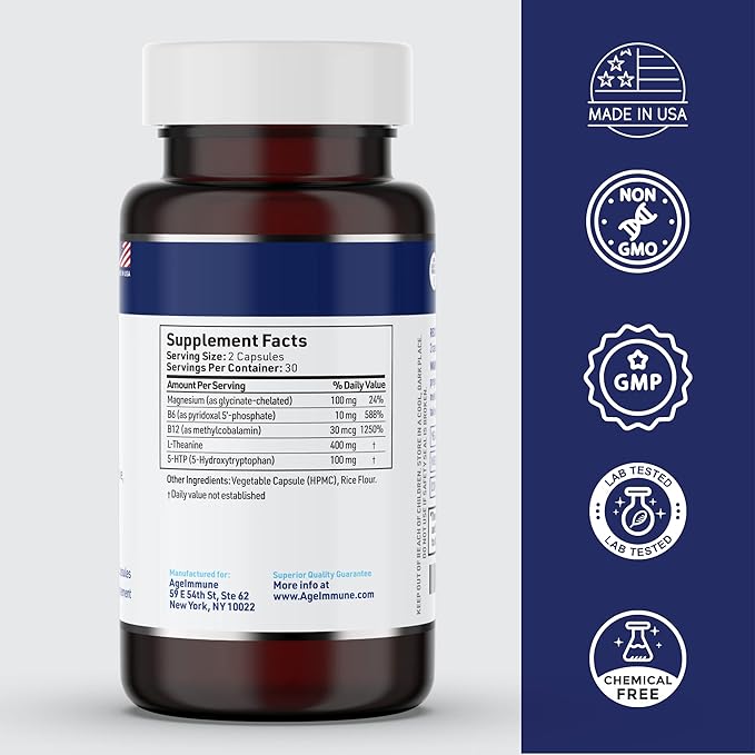 5-HTP Formula for Stress Relief and relaxation support for Teens and Adults with 5-HTP, L-Theanine, Vitamin B6, Vitamin B12, Magnesium - Doctor Formulated - Magnesium Stearate Free - 60 capsules.