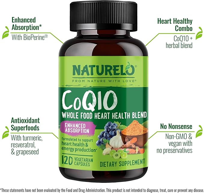 NATURELO Whole Food CoQ10 with Heart Health Blend, Powerful Antioxidant for Energy Production, 120 Capsules