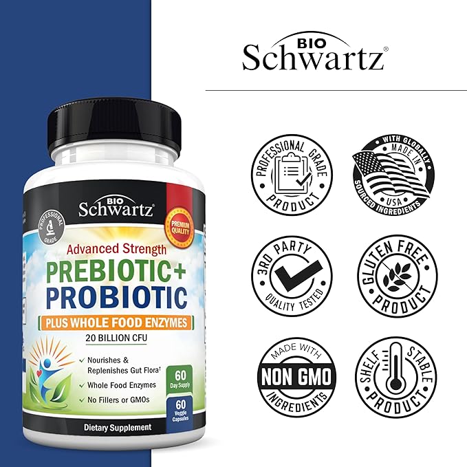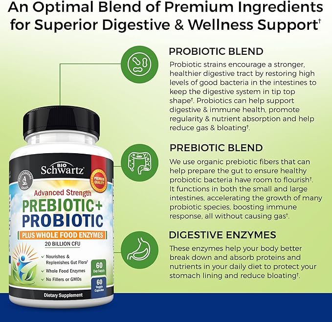 - Helps support digestive health: BioSchwartz’s prebiotic + probiotic 60 count mixes the best of both worlds in order to help your digestive tract flourish! The prebiotic can act as a fertilizer for the probiotic which helps to promote the good bacteria in your intestines in order to improve the function of your digestive system
