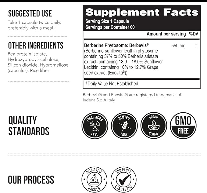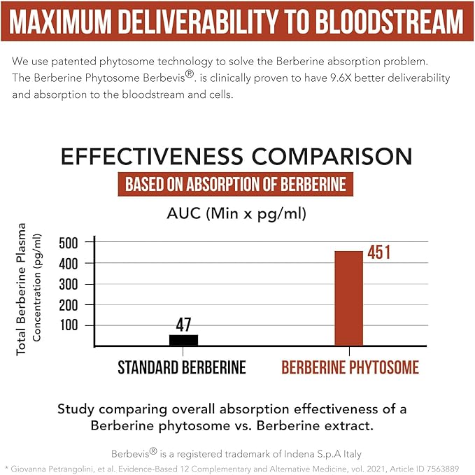 - 9.6X HIGHER ABSORPTION COMPARED TO STANDARD BERBERINE: In a clinical trial our Berberine phytosome was shown to have 9.6X (960%) higher absorption compared to standard Berberine.