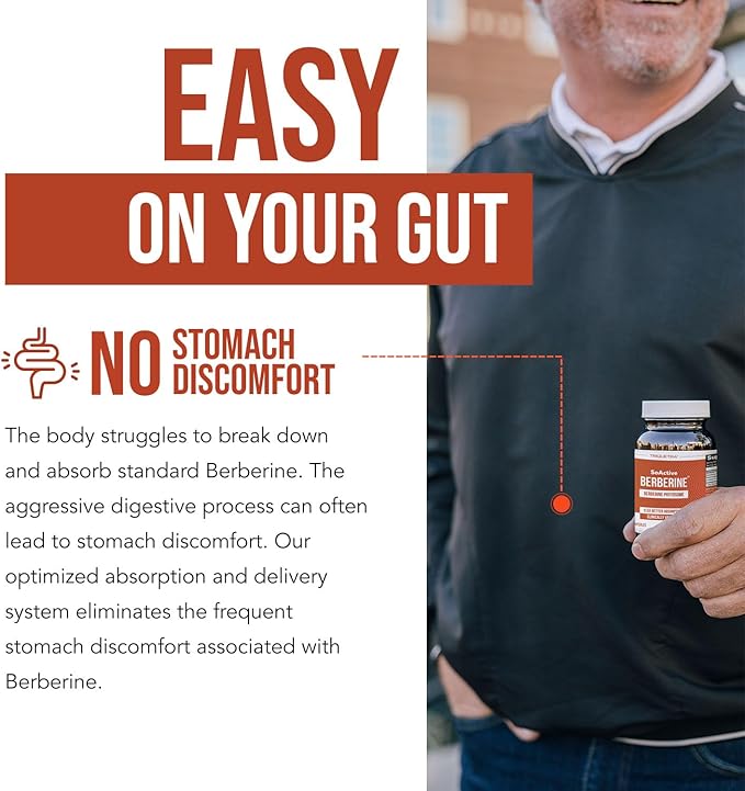 - NO STOMACH DISCOMFORT: The body struggles to breakdown and absorb standard Berberine; the aggressive digestive process can often lead to stomach discomfort. Our optimized absorption and delivery system eliminates the frequent stomach discomfort associated with Berberine.