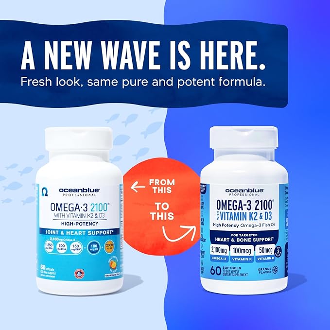 Oceanblue Professional Omega-3 2100 with Vitamin K2 and Vitamin D3-60 Count - Triple Strength Burpless Fish Oil Omega-3 Supplement with EPA, DHA & DPA - Wild Caught - Orange Flavor, 30 Servings
