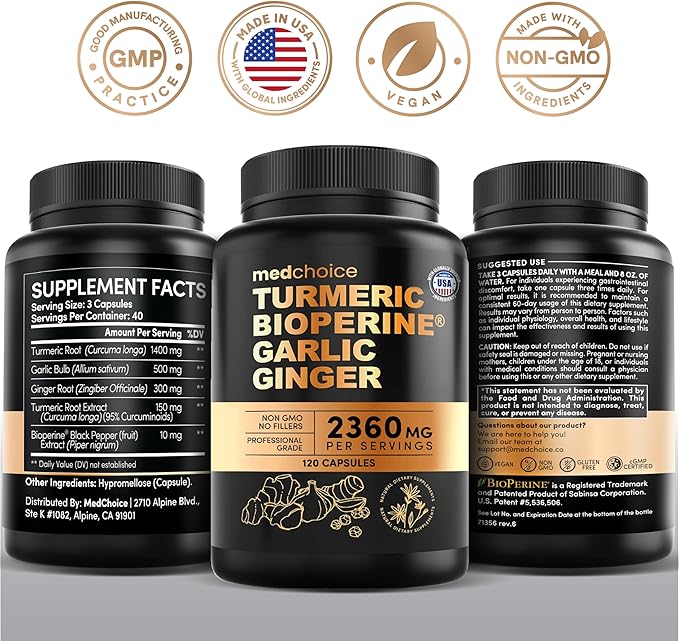 4-in-1 Turmeric and Garlic Supplements with Bioperine 2360 mg Turmeric Ginger Root Capsules with Garlic for Joint, Digestion & Immune Support (120ct, Pack of 4)