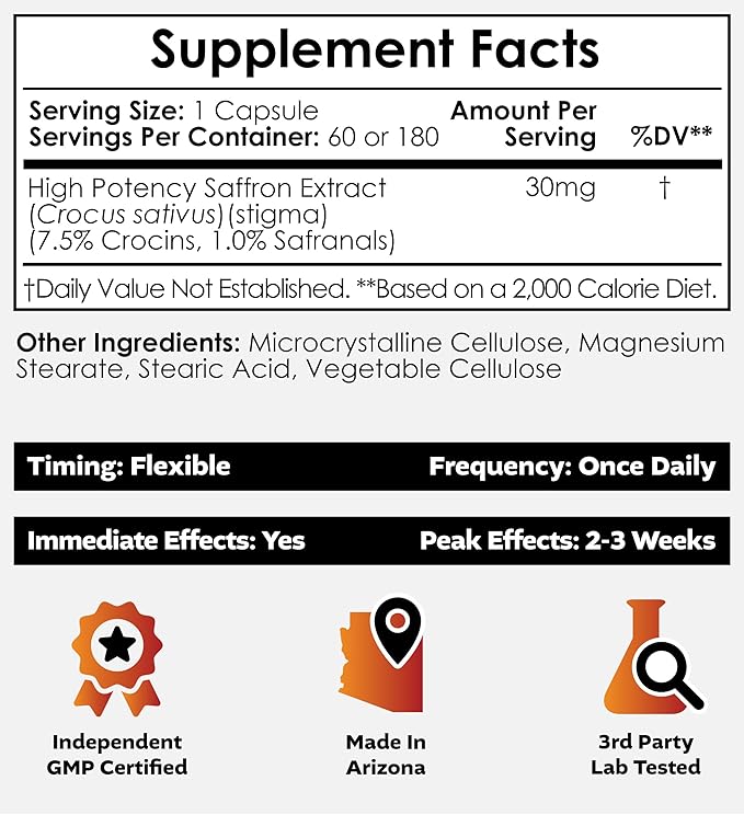 - High Potency Extract: Standardized to 7.5% crocins and 1% safranals, optimizing the extract to leverage Saffron's natural health-boosting capabilities.