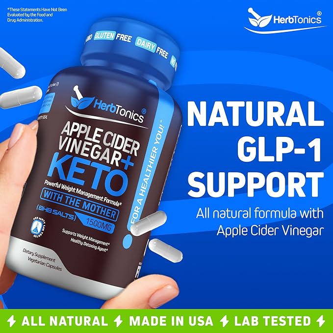 Herbtonics Apple Cider Vinegar with Keto BHB Salts - GLP-1 Support Supplement for Metabolism and Appetite Control, 240 Capsules.