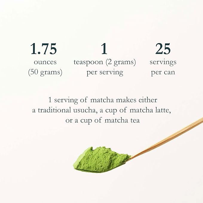 - ✓ Our Organic Ceremonial Grade Matcha in Resealable Packaging - A resealable package for those who purchase regularly but do not want to accumulate empty cans. Our 1.75 oz / 50g package serves a total of 25 servings. 1 tsp (2 grams) of matcha powder makes either a cup of matcha tea (usucha) or a small matcha latte. We recommend to beginners looking for a decent, all rounded organic ceremonial grade matcha that provides good value for the price.
