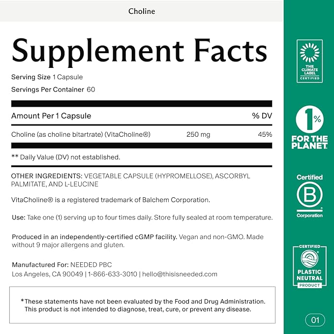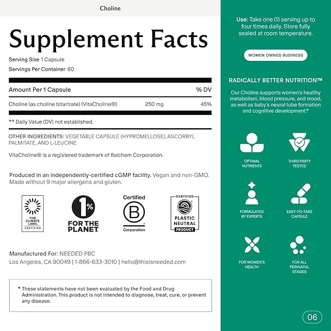 Needed. Prenatal Choline for Cognitive Development - Choline Supplement Aids Baby Brain Development - Supports Healthy Pregnancy & Metabolism - Third Party Tested - 60 Capsules