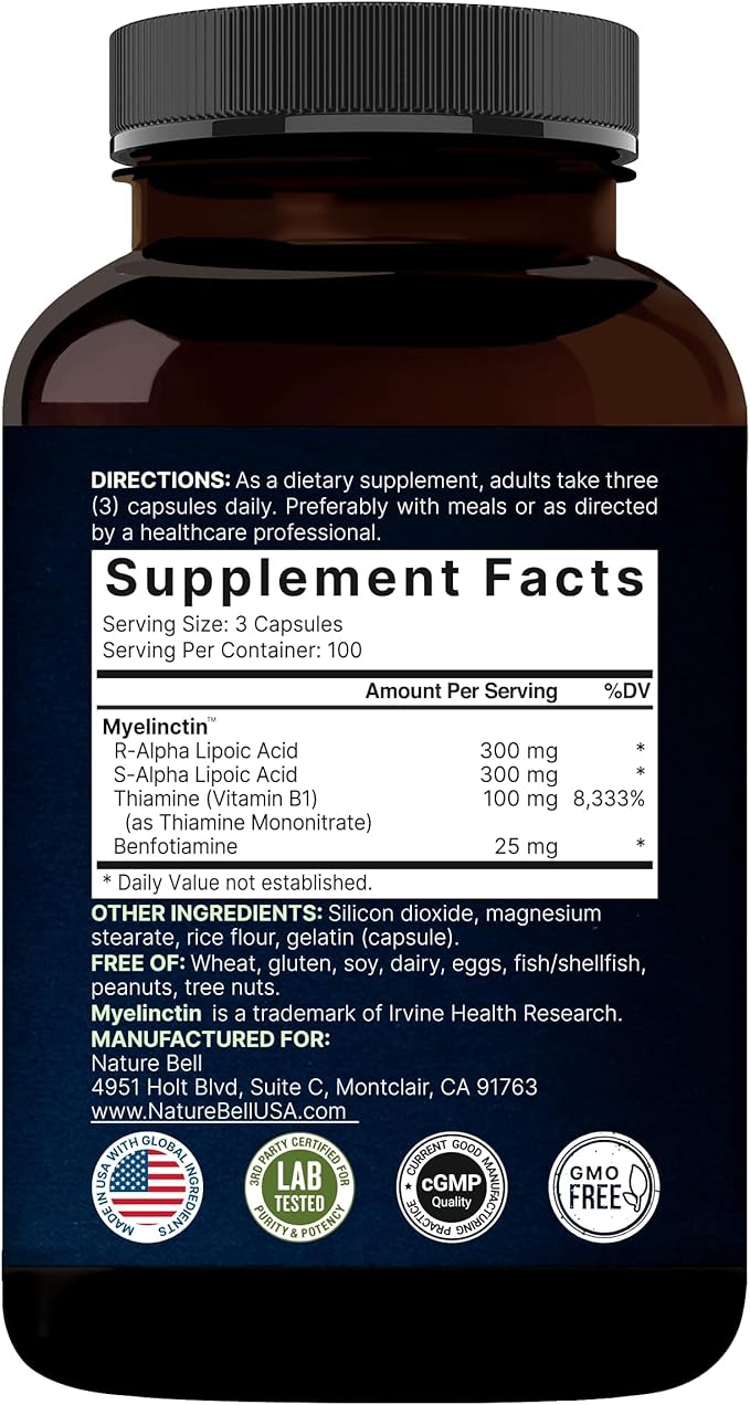 NatureBell Alpha Lipoic Acid Complex, 600mg, 300 Capsules | 4-in-1 Myelinctin Formula with R-ALA, S-ALA, Thiamine & Benfotiamine | High Absorption & Antioxidant Support | Non-GMO, Gluten-Free