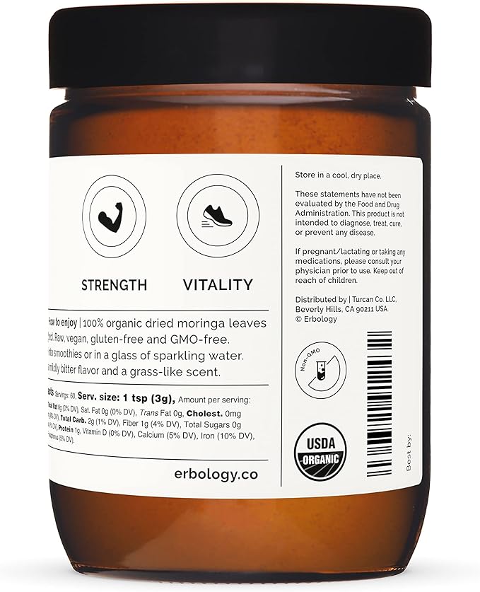 Erbology Organic Moringa Leaf Powder 3.2 oz - 45 Servings - Body Cleansing - Immunity Support - Rich in Iron - Sustainably Sourced Straight from Farm in India - Small Batch - Vegan - GMO-Free
